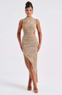 Command attention in the alluring Stella Midi Dress. Crafted from a luxurious textured stretch fabric, this dress is designed to hug your every curve for a figure-flattering silhouette. The asymmetric skirt features a daring thigh-high split, adding a touch of drama and sophistication.